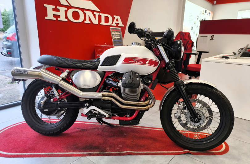 Un scrambler, avec une ligne d'échappement Arrow, des jantes à rayons, plusieurs pièces en aluminium garde-boue,repose-pieds, corps d'injection et plaques numéro. Une belle décoration, avec un réservoir blanc avec bande rouge intégrant le sigle de la marque italienne. Notre modèle est en plus équipé d'un sytème freins et enbrayage complet de marque BERINGER, une fourche équipée d'un kit cartouche Andreani et d'amortisseurs EMC.